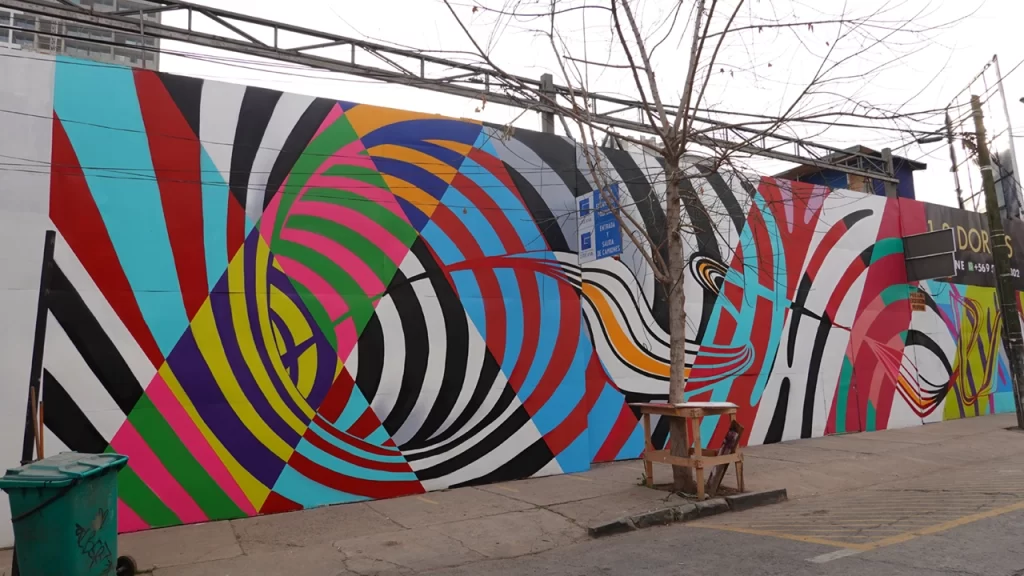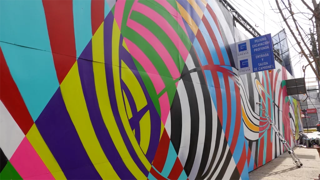 Encargo de pintura para cierre perimetral en Irarrazabal, Santiago de Chile, año 2021. El diseño fue definido en conjunto con Cecilia Sabaini y Loreto Rodriguez, AVSA.
