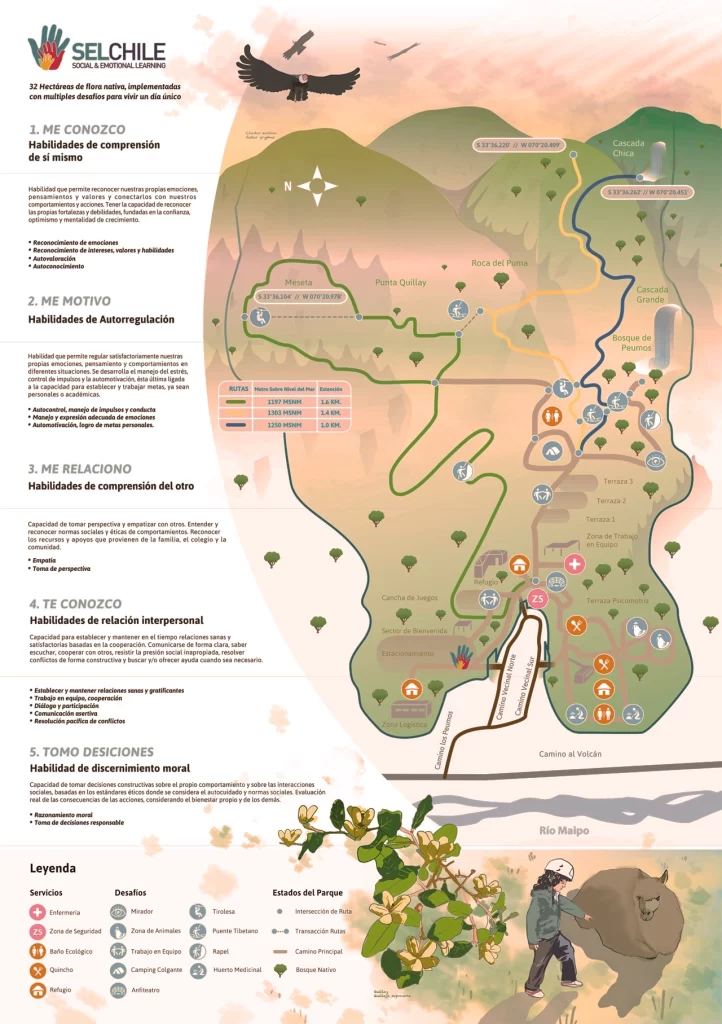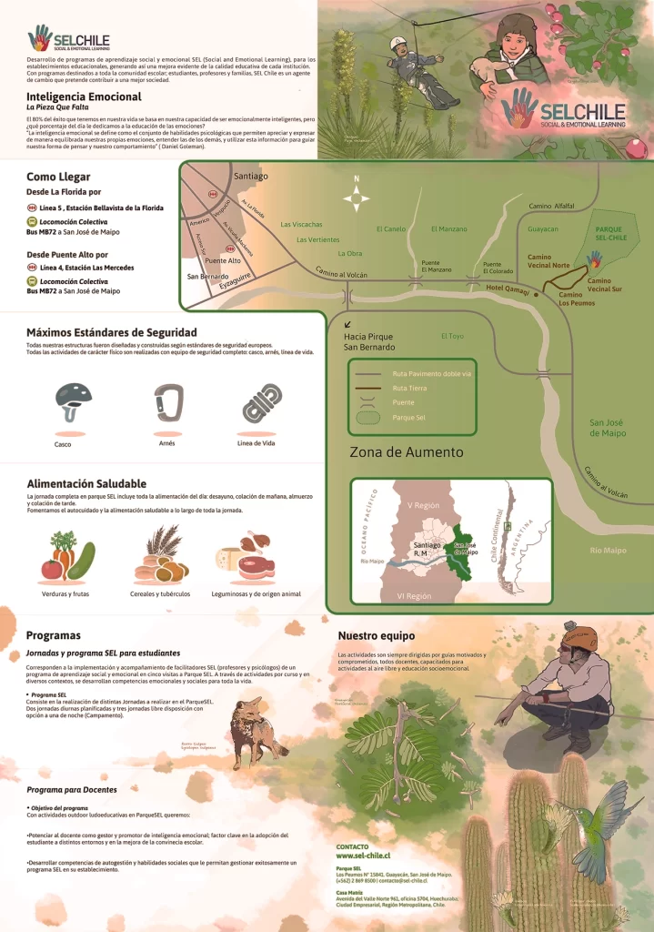 Desplegable de bolsillo que sintetiza la oferta pedagógica del parque SEL con sus rutas y estaciones de aprendizaje. Esta pieza luce cómo se atienden las distintas capacidades sociales y emocionales de estudiantes, profesores y otros profesionales además de indicar las medidas de seguridad y la ruta más adecuada para llegar desde Santiago. Las estaciones y puntos geográficos más importantes se destacan con un sistema de íconos y símbolos específicos para el encargo, ilustraciones de la flora y fauna características del lugar adornan el impreso dándole un particular atractivo. conceptos: Educación, Seguridad, Patrimonio Natural. requerimientos: Diseño de información para la oferta de aprendizaje socioemocional.