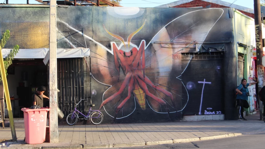 Trabajo inspirado en Ormiscodescinnamomea, mariposa comepino. Pintado en Recoleta, Santiago de Chile 2021. Se dice que la visita de una mariposa nocturna en casa es la presencia de un familiar fallecido que está de visita en esta nueva forma. Mural pintado en calle el salto chico con cementerios. Técnica Mixta / año 2022