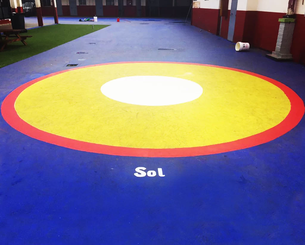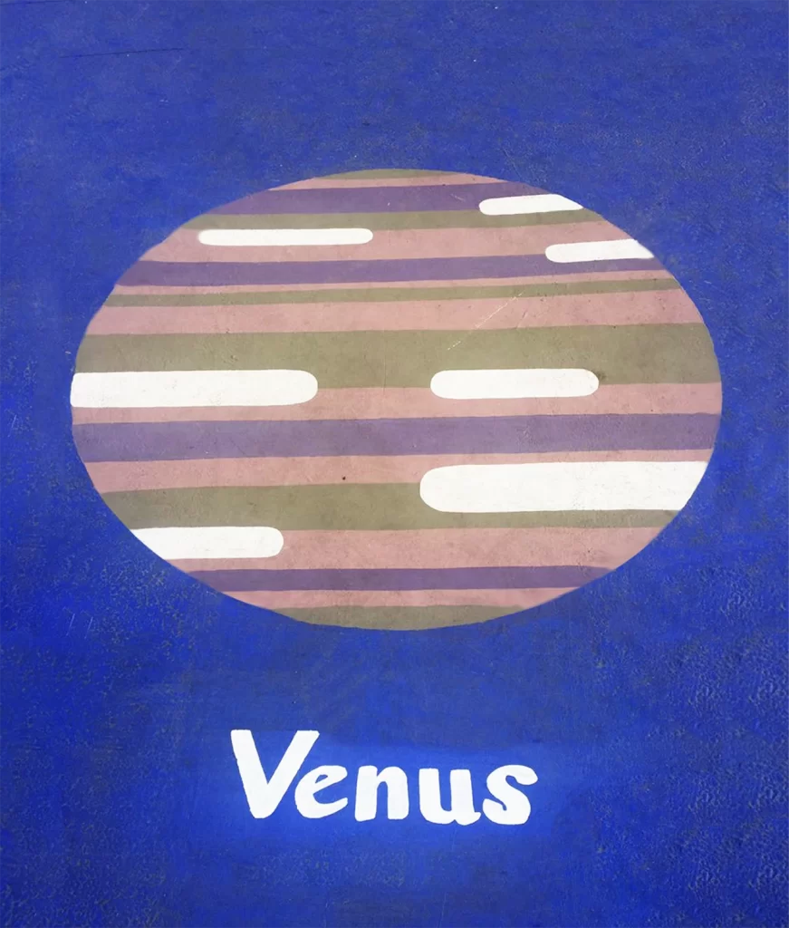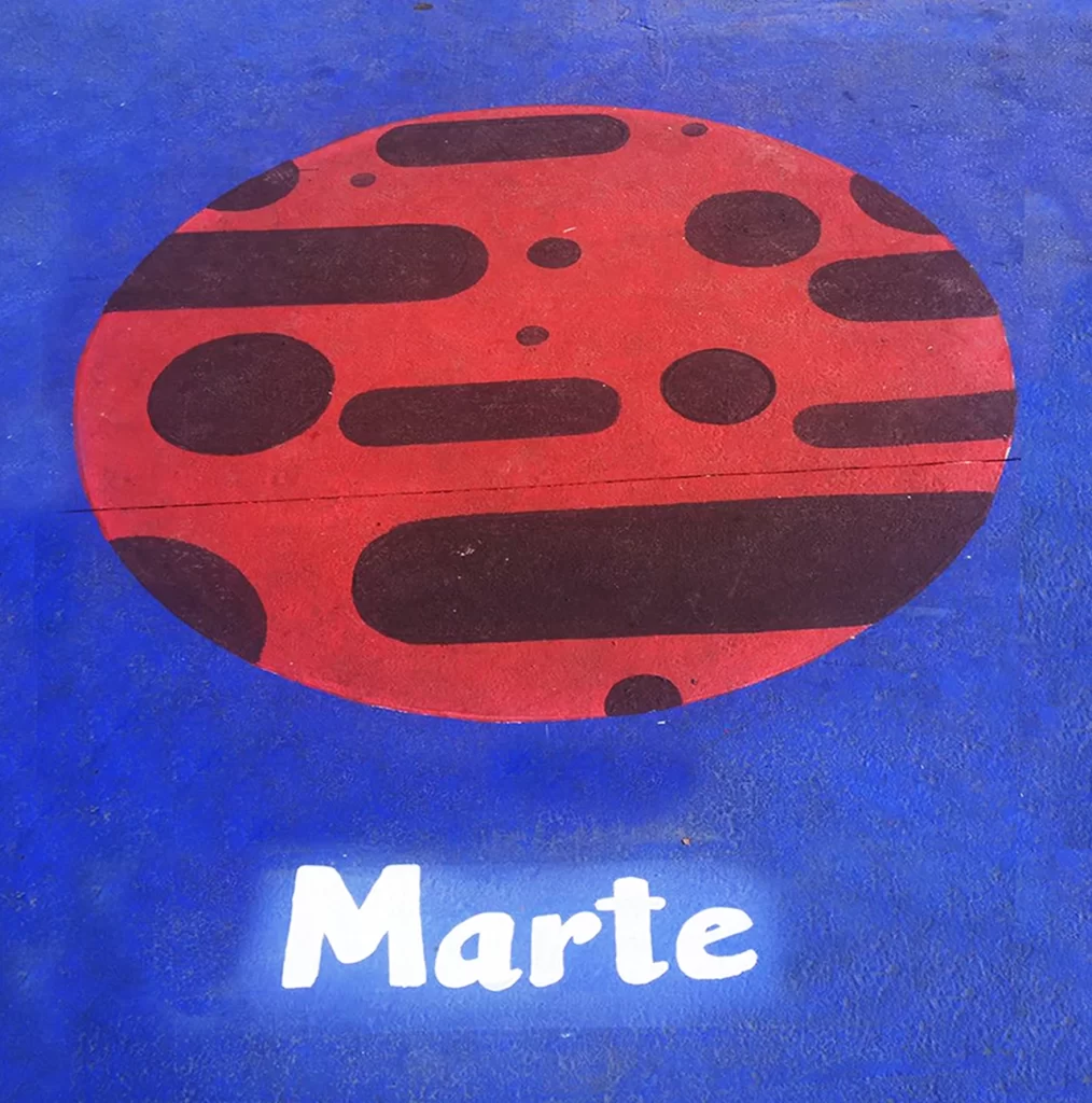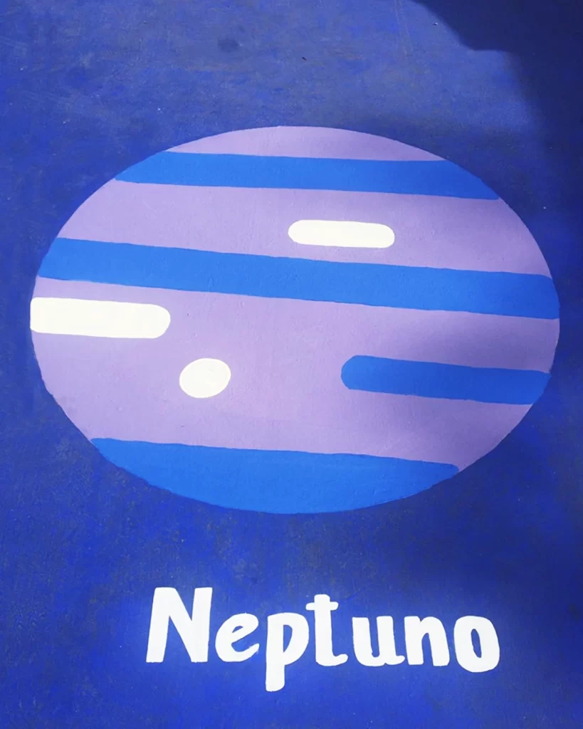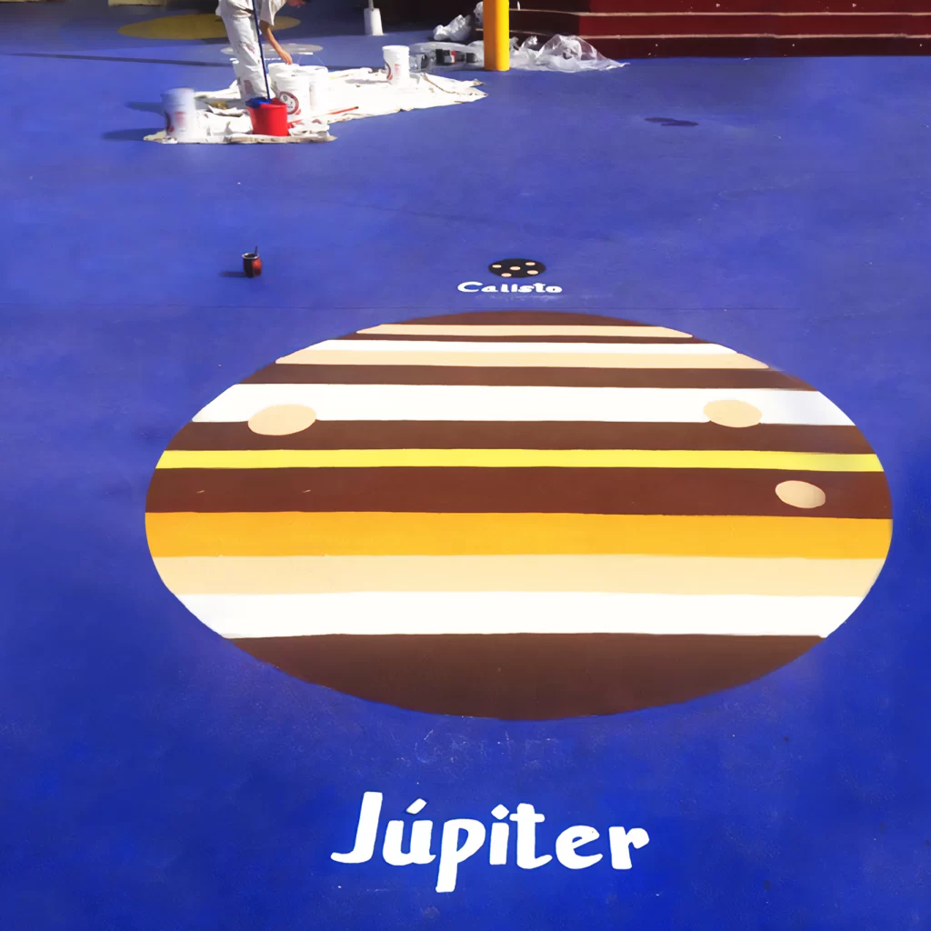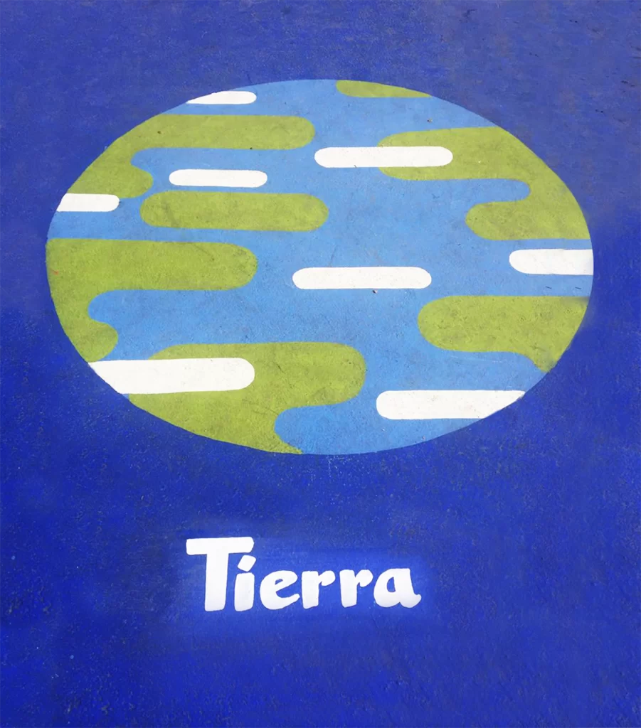 El suelar identifica las principales galaxias reconocidas por la cosmovisión-astronomía Mapuche, además del sistema solar con sus planetas. Los mapuches usaron nombres de alimentos, aves y reptiles para nombrar las constelaciones. Por ejemplo a PLEYADES lo denominan GAW POÑÜ (papas arrumadas). Todas las constelaciones pintadas llevan su nombre en español y en mapuzungun.Encargo de pintura suelar en Escuela San Vicente Ferrer de Cerro Navia, año 2017. Más de 500 mts2 aproximados. Ejecutado con Andrés García quien siempre confió en nuestro trabajo.